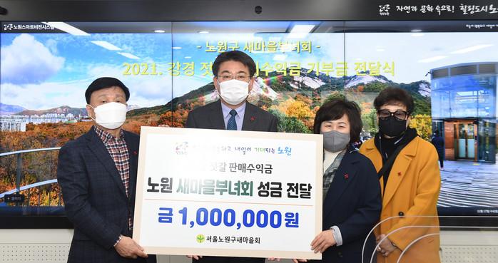 서울 노원구는 최근 지역내 어려운 이웃을 위해 지난달 새마을부녀회에서 시행한 강경 젓갈 직거래장터 판매수익금 100만원을 기부하는 노원 새마을부녀회 성금 전달식을 진행했다. 사진은 전달식에서 오승록 구청장(왼쪽 두 번째)과 관계자들이 기념촬영을 하는 모습. (사진제공=노원구청)
