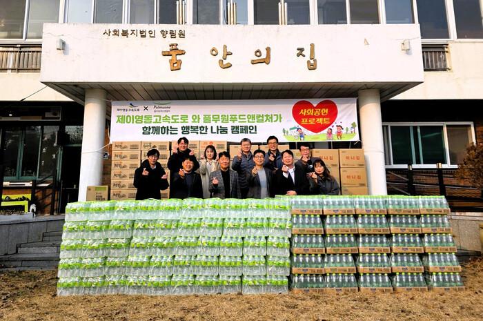 기부 물품 전달식은 지난 29일 경기도 광주시 곤지암읍에 위치한 사회복지법인 향림원에서 제이영동고속도로㈜ 민 욱 대표, 풀무원푸드앤컬처 김경순 휴게소영업본부 본부장을 비롯해 향림원 관계자, 휴게소 임직원 등이 참석한 가운데 열렸다.