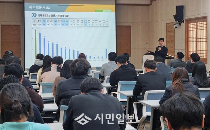 이번 교육은 도로유지보수, 시설물 관리, 환경미화 등 군이 수행하는 다양한 작업현장에서 도출된 위험요인을 직원들이 이해하고, 개선 방안을 공유하여 실제 업무에 반영할 수 있도록 하기 위해 마련됐다.