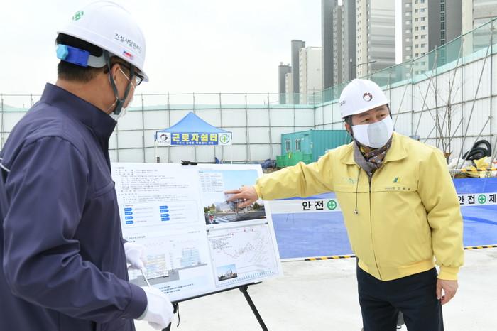 경기 구리시가 최근 중대재해 처벌 등에 관한 법률 시행과 해빙기를 맞이해 갈매동 복합청사와 구리전통시장 제2공영 주차빌딩 공사현장에 대한 안전점검을 실시했다. 사진은 안승남 시장(오른쪽)이 현장을 방문해 관계자로부터 추진 현황을 보고받고 있는 모습. (사진제공=구리시청)