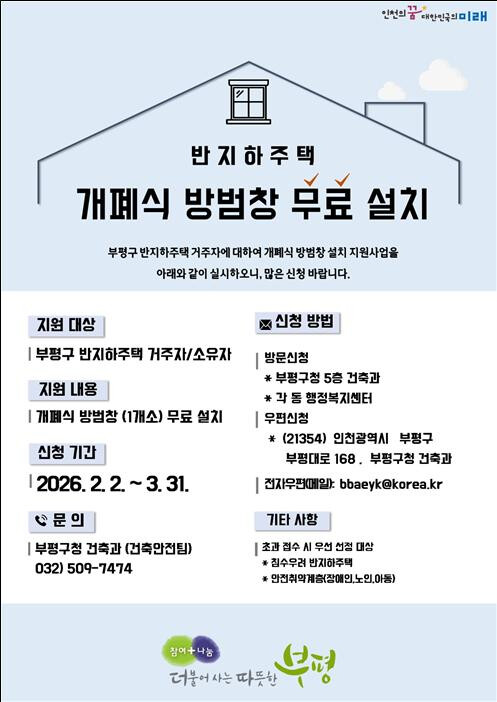 지원 대상은 부평구 내 반지하주택 거주자(소유자)이며, 방범창 설치는 전액 무료로 이뤄진다.