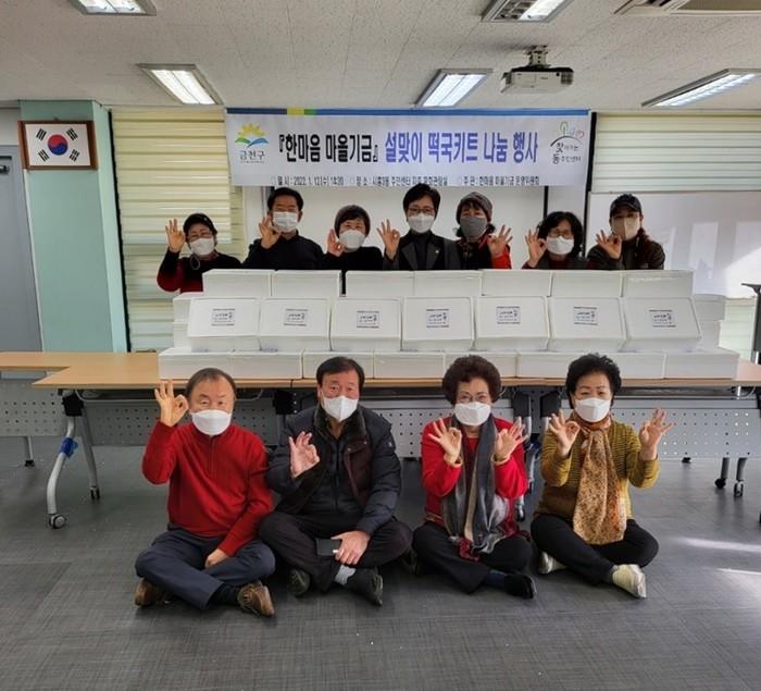 서울 금천구 시흥3동 주민들은 12일 새해를 맞아 주민들이 마을을 위한 사업을 추진하기 위해 십시일반 모은 ‘한마음 마을기금’을 사용해 저소득층 이웃 60가구에 떡국 키트 나눔을 실천했다. 사진은 행사에 참여한 주민들이 기념촬영을 하는 모습. (사진제공=금천구청)