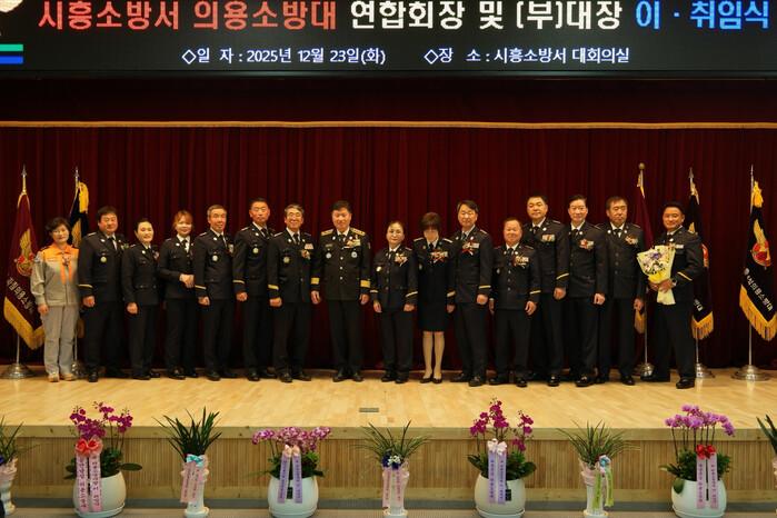 | ▲ 의용소방대 대장 이·취임식 참석자들이 기념 촬영을 하고 있다 /사진제공=시흥소방서 |