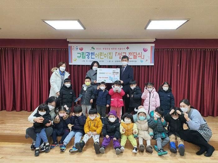 은평구 갈현2동은 최근 구립광현어린이집으로부터 교직원과 원생 어린이들이 2022 희망온돌 따뜻한 겨울나기 모금 활동으로 모은 따뜻한 겨울나기 성금 27만2250원을 전달받았다. 사진은 전달식에서 원생들 및 관계자들이 기념촬영을 하고 있는 모습. (사진제공=은평구청)