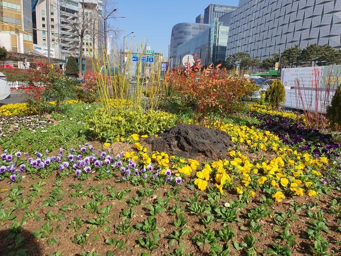 | ▲ 잠실역사거리 교통섬에 조성한 ‘봄철 테마화단’. (사진=송파구청 제공) |
