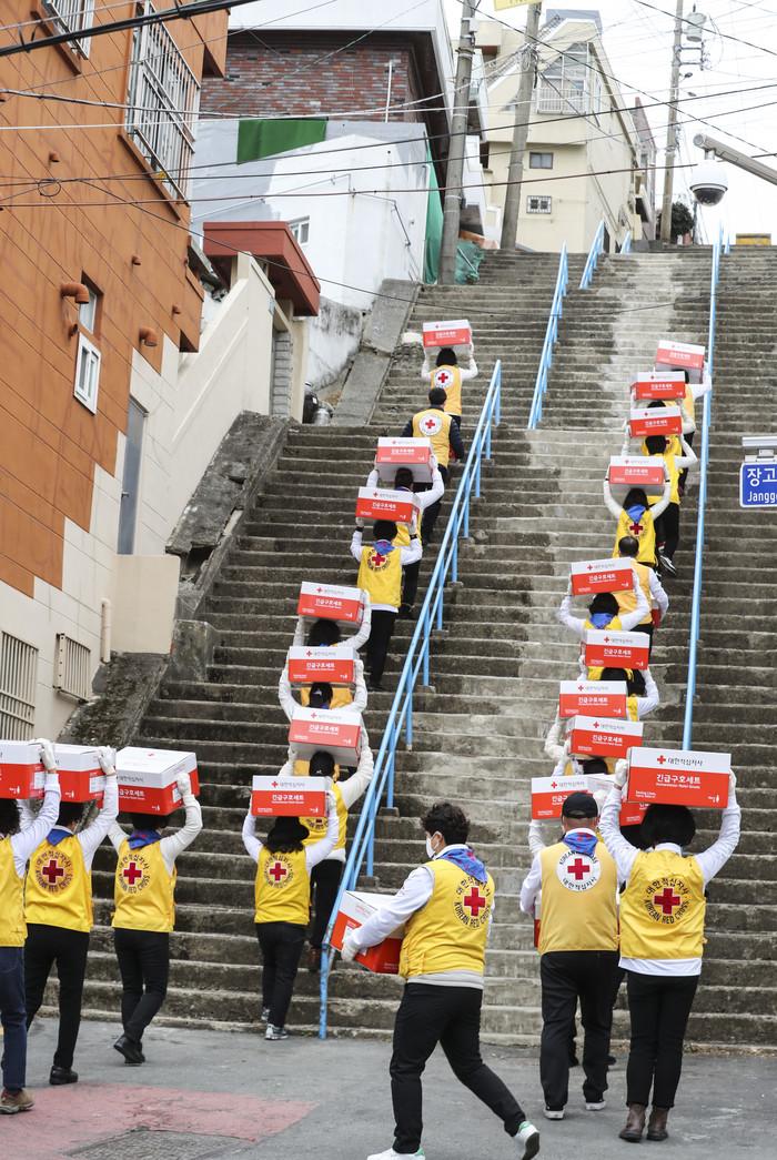설 연휴를 일주일여 앞둔 24일 오전 부산 남구 한 주택가에서 적십자 봉사원들이 취약계층에 전달할 구호품을 이고 걸어가고 있다.