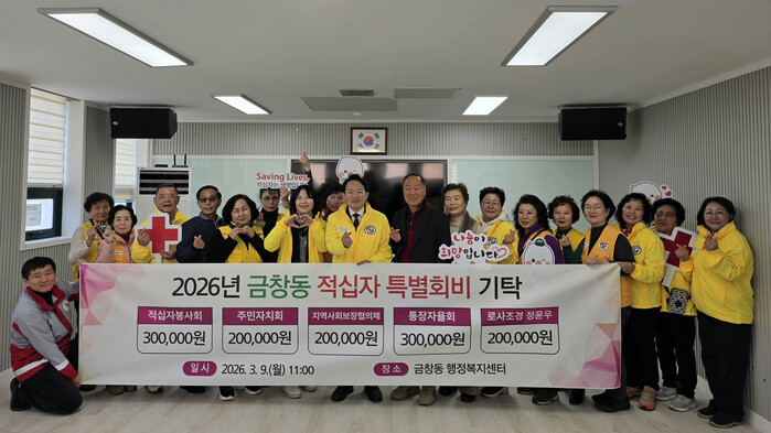 이날 기탁된 특별회비는 ▲금창동 적십자봉사회 30만원 ▲통장자율회 30만원 ▲주민자치회 20만원 ▲지역사회보장협의체 20만원 ▲정윤우 로사조경 대표 20만 원 등 총 120만원이다. 해당 성금은 대한적십자사에 전달되어 향후 재난 구호 및 취약계층 지원 사업 등에 사용될 예정이다.