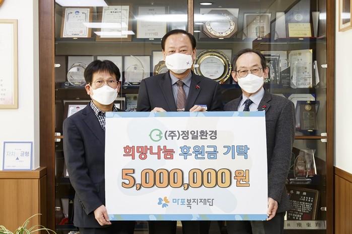 서울 마포복지재단은 18일 (주)정일환경으로부터 기부문화 활성화 및 아름다운 나눔을 실천하기 위한 후원금 500만원을 전달받았다. 사진은 전달식에서 유동균 구청장(가운데)과 관계자들이 기념촬영을 하는 모습. (사진제공=마포구청)