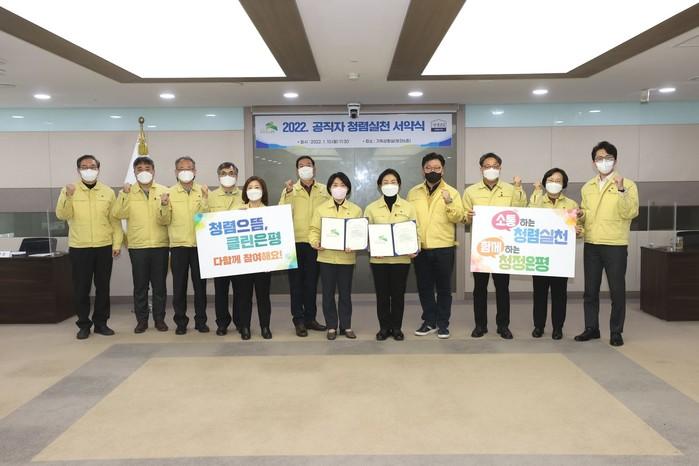 서울 은평구는 최근 구청장 등 간부 공무원이 참석한 가운데 ‘2022년 공직자 청렴 실천 서약식’을 개최해 청렴한 공직사회로 가기 위한 청렴 실천을 다짐했다. 사진은 공직자 청렴실천 서약식에 참여한 김미경 구청장(오른쪽 다섯 번째)과 간부 공무원들이 기념촬영을 하는 모습.(사진제공=은평구청)