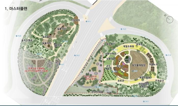 먼저 북측에는 기존 지형과 자연물을 살려 숲놀이터와 숲속쉼터를 조성된다. 숲놀이터에는 놀이시설물, 숲속쉼터에는 체력단련장과 휴게공간 등이 만들어질 예정이다.