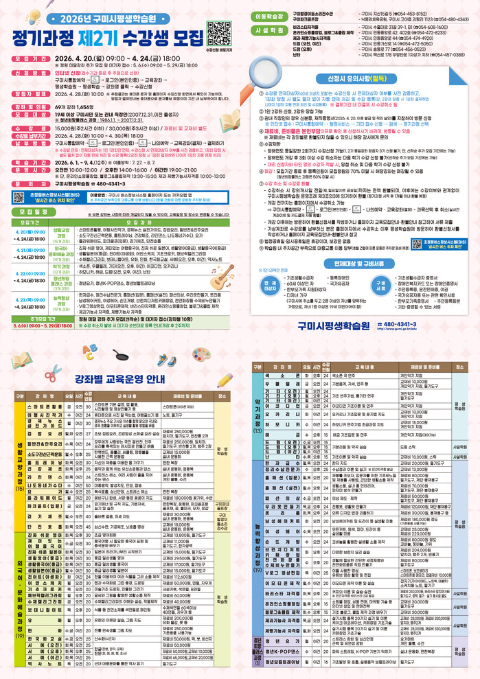 수강 신청은 19세 이상 시민 또는 지역내 직장 재직자를 대상으로 하며, ‘구미시통합예약’ 포털에서 인터넷 접수 후 전산 추첨으로 선발한다. 원활한 신청을 위해 과정별로 5일간 순차 접수를 진행할 예정이다.