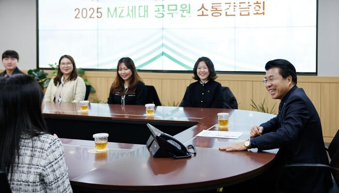 | ▲ 서강석 구청장(오른쪽)이 MZ직원과 간담회에서 대화를 나누고 있다. (사진=송파구청 제공) |