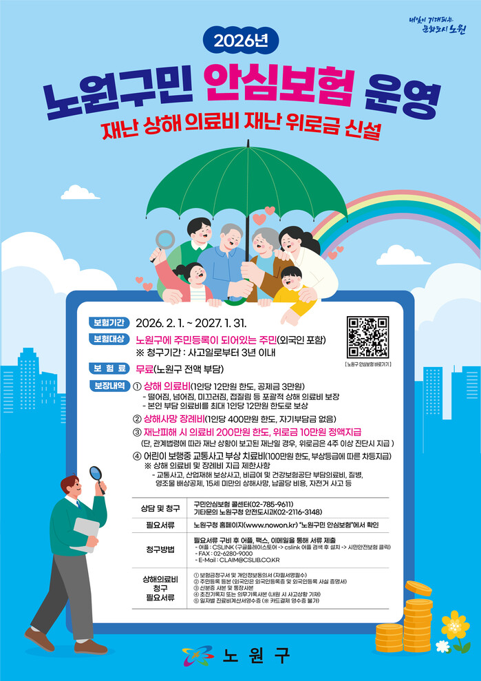 [시민일보 = 박소진 기자] 서울 노원구(구청장 오승록)가 일상생활에서 발생할 수 있는 각종 사고로부터 피해 주민의 신속한 경제적 회복을 돕기 위해 '노원구민 안심보험'을 운영한다고 밝혔다.