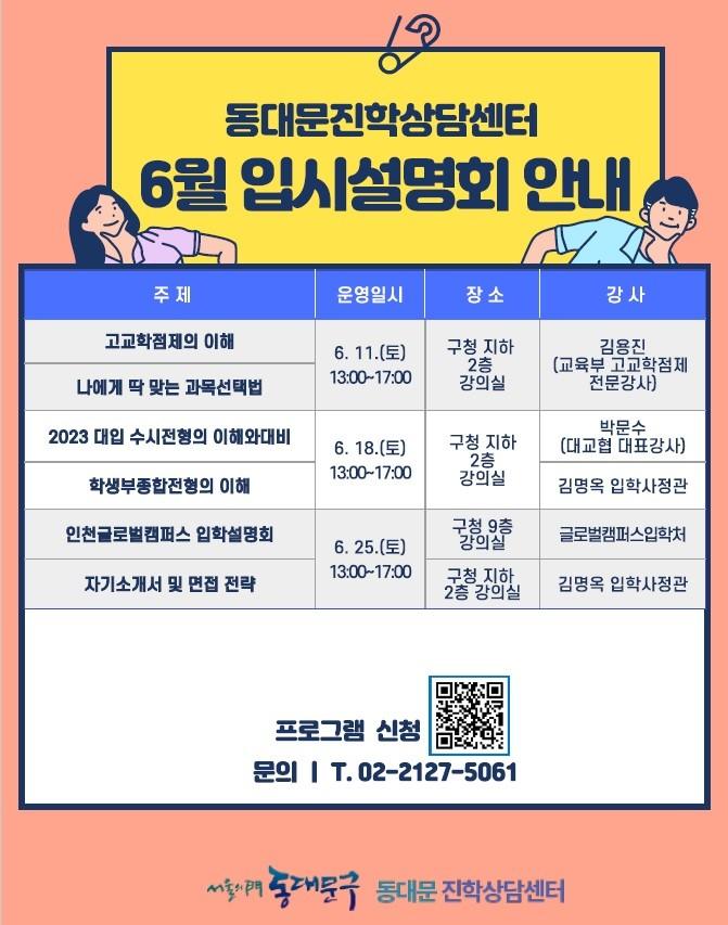 구 관계자는 “이번 ‘동대문진학상담센터 6월 설명회’는 대입을 준비하는 학생과 학부모에게 고교학점제, 대입전형 등 복잡한 진학 정보를 알기 쉽게 전달하기 위해 마련됐다”며, “지역의 미래인 학생들의 풍요로운 삶과 올바른 성장을 위해 앞으로도 주민들의 요구에 맞춰 다양한 진학프로그램을 제공할 수 있도록 최선을 다하겠다”고 밝혔다.