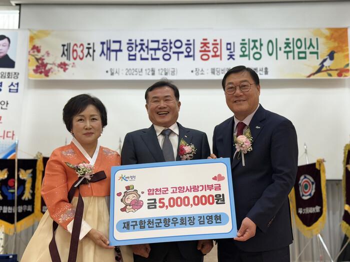 이날 기탁식에는 재구합천군향우회 신임회장으로 취임한 김영현 씨와 (사)한국외식업중앙회 대구지회 달서구지부장 강영대 씨가 각각 고향사랑기부금 500만 원씩, 총 1,000만 원을 기탁했다.