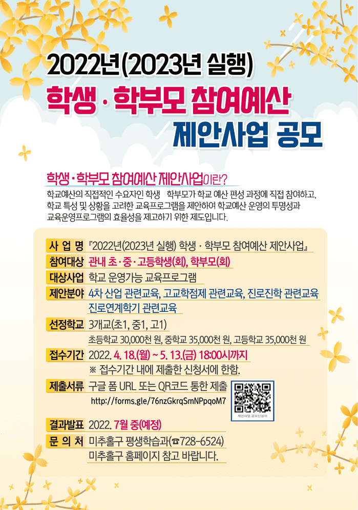| ▲ 2022년 학생·학부모 참여예산 제안사업 공모 안내문. (사진제공=인천 미추홀구청) |