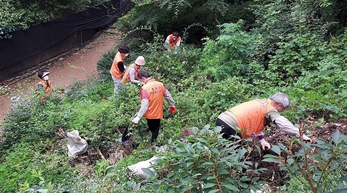 | ▲ 지난 14일 주민들이 노량진근린공원 고구동산에서 생태계 교란식물을 제거하고 있다. (사진제공=동작구청) |