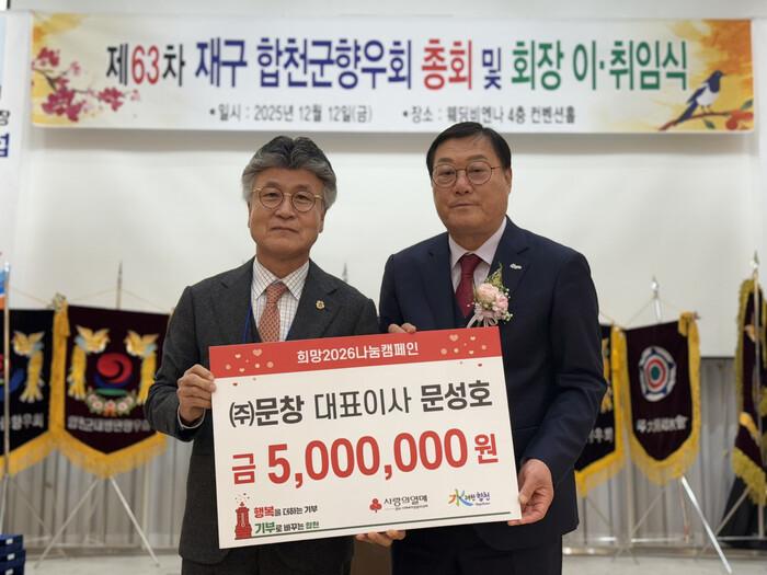 합천군 율곡면 출신의 문성호 대표는 “고향의 어려운 이웃들에게 따뜻한 희망이 전해지길 바라는 마음으로 기탁하게 되었다.”며 “앞으로도 이웃들과 더불어 사는 지역사회를 만드는 데 힘을 보태겠다.”고 전했다.