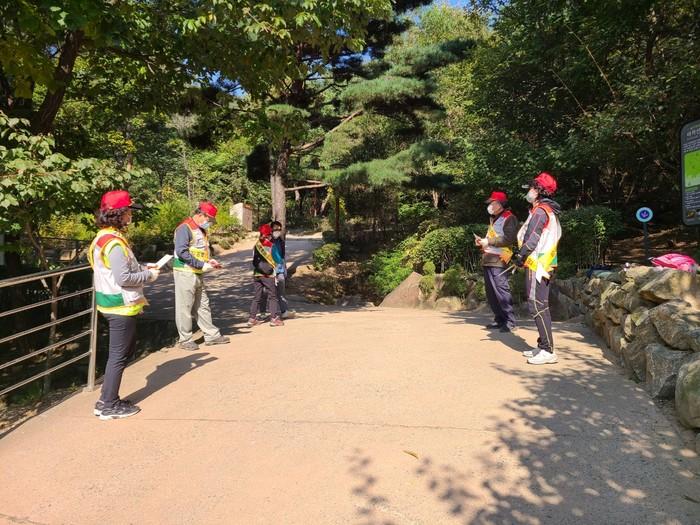 서울 광진구가 2021년 가을철 아차산 산불방지대책본부를 구성해 오는 12월15일까지 운영한다. 운영시간은 평일 오전 9시~오후 9시 ▲휴일 및 공휴일 오전 10시~오후 9시로, 공원녹지과 사무실에서 직원 22명이 교대로 근무하며 유사시를 대비한다. 사진은 아차산에서 가을철 산불예방 캠페인을 진행하고 있는 모습. (사진제공=광진구청)