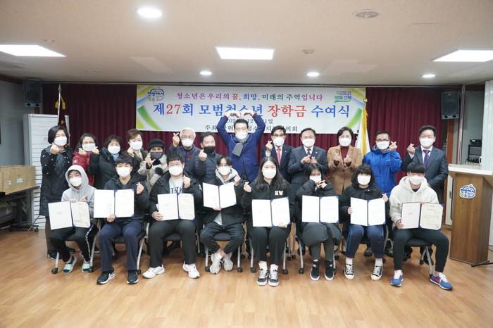 서울 성북구 장위2동 청소년지도협의회는 최근 선발된 지역내 모범청소년 8명에게 장학금 총 200만원을 전달했다. 사진은 수여식에서 이승로 구청장(뒷줄 가운데)과 모범청소년 및 관계자들이 기념촬영을 하는 모습. (사진제공=성북구청)