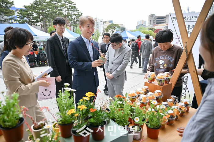 김이강 광주광역시 서구청장이 20일 서구청 광장에서 열린 ‘제46회 장애인의 날 기념 행사’에서 장애인복지시설 부스에 판매되고 있는 화분을 살펴보고 있다.(사진=서구청 제공)
