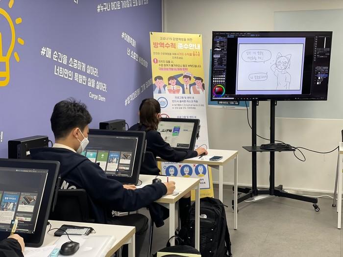 | ▲ 동대문진로직업체험지원센터 이모티콘이나 생활툰을 완성하고 직접 플랫폼에 등록해 보는 신규 특화 프로그램 ‘메이커 스쿨’에 참여한 대광중학교 학생들의 모습. (사진제공=동대문구청) |