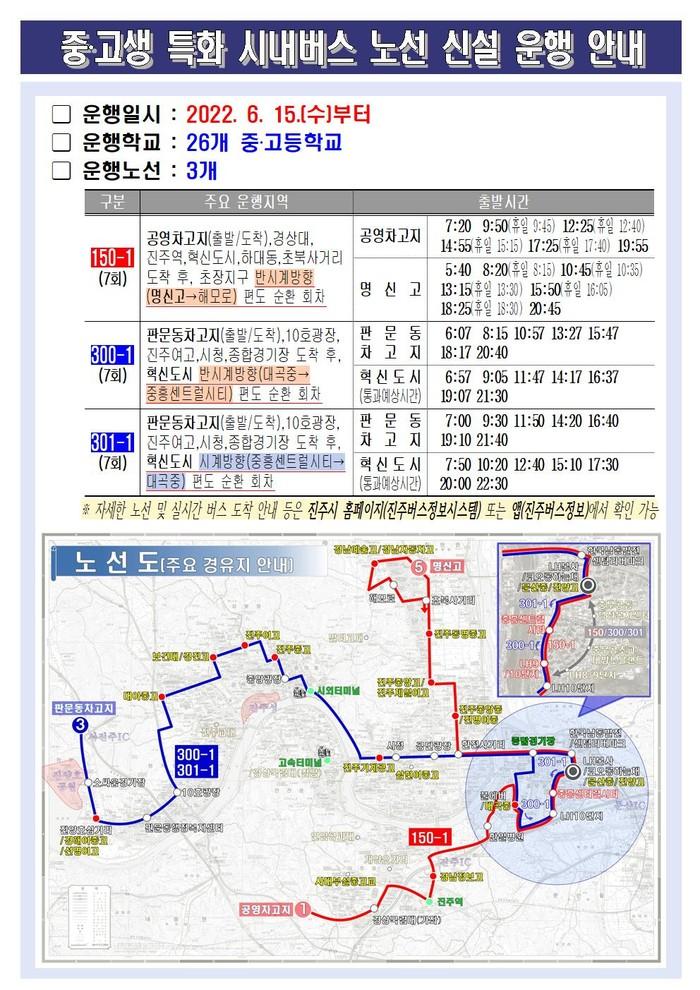 이번 진주시의 시내버스 노선 신설은 코로나19로 인해 시내버스 전체 이용객이 약 30% 감소한 상황에서도 이용객 증가 추세를 보이는 지역과 도심 중·고교를 연결하여 학생들의 편리한 통학을 돕기 위한 것이다. 신설 노선 번호는 150-1·300-1·301-1번이다.