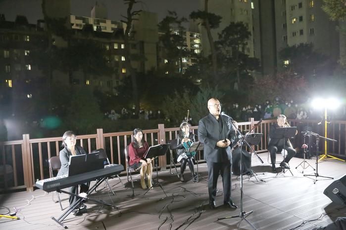 서울 강북구가 최근 ‘불을 끄면 행복이 온다’는 주제로 공동주택으로 찾아가는 환경음악회를 열었다. 사진은 강북구 공동주택 광장에서 열린 작은 환경음악회에서 성악가가 가곡을 부르고 있는 있는 모습. (사진제공=강북구청)