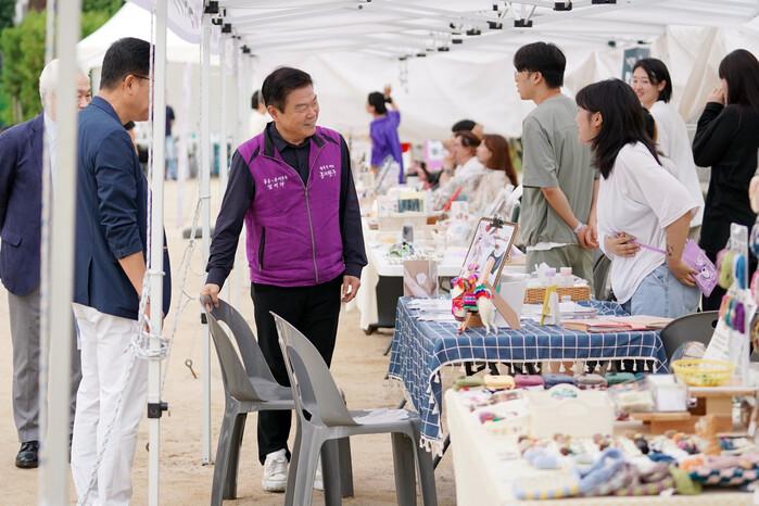 | ▲ 동대문구 청년주간행사에 참석한 이필형 동대문구청장이 동청제 부스존을 운영중인 청년들과 인사를 나누고 있다. |