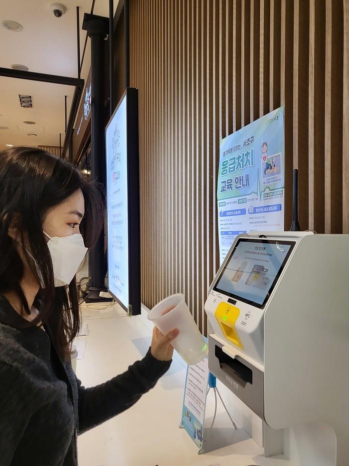 | ▲ 서초구청사 내 다회용컵 무인반납기 이용을 하고 있는 모습. (사진=서초구청 제공) |