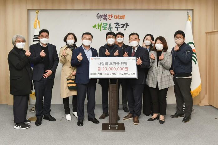 서울 중랑구 면목7동 주민센터는 최근 라온건설과 지음개발, 우신윈시스템으로부터 총액 2300만원의 이웃돕기 성금을 전달받았다. 전달받은 성금은 여성청소년을 위한 위생용품을 지원하고 지역내 취약계층을 돕는 데 쓰일 예정이다. 사진은 이날 류경기 구청장(왼쪽 네 번째)이 관계자들과 기념촬영을 하는 모습. (사진제공=중랑구청)