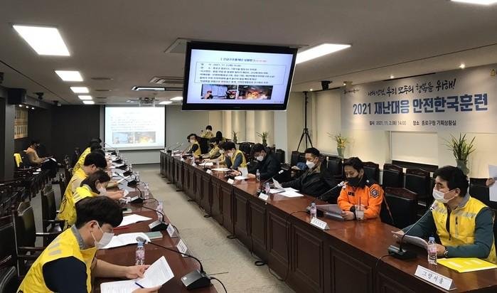 서울 종로구는 최근 '2021년 재난대응 안전한국훈련'을 실시했다. 지역내 다중이용시설인 그랑서울 빌딩 지하주차장내 화재 발생을 가정해 최초 119 상황 접수에서부터 수습·복구단계까지 훈련을 실시하고, 재난현장 선발대인 통합지원본부의 임무·역할에 대한 교육도 병행했다. 사진은 이날 안전한국 훈련이 진행되고 있는 모습. (사진제공=종로구청)