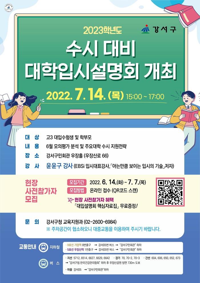 구는 오는 7월14일 강서구민회관 우장홀에서 '2023학년도 수시 대비 대학입시 설명회'를 개최한다고 밝혔다.
