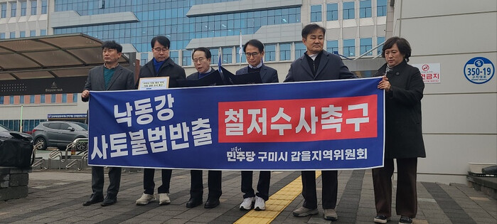 [구미=박병상 기자] 더불어민주당 구미시(갑·을)지역위원회(구미갑 김철호 위원장, 구미을 이상호 위원장 직무대행)는 최근 구미경찰서에서 기자회견을 열고, 구미시가 역점적으로 추진한 낙동강 도시 생태축 복원 사업 과정에서 진행된 사토 매각 비리 의혹과 관련한 수사 촉구 성명서를 발표하고 구미경찰서에 공식 수사 촉구 서한을 전달했다.