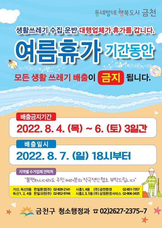 [시민일보 = 여영준 기자] 서울 금천구(구청장 유성훈)는 청소대행업체 환경미화원 전원이 여름휴가에 들어감에 따라 생활쓰레기 수거를 일시 중단한다고 26일 밝혔다.