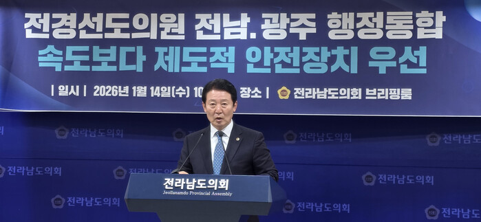 [남악=황승순 기자]전라남도의회 전경선 의원(더불어민주당·목포5)은 14일, 전라남도의회 브리핑룸에서 기자회견을 열고, 전남-광주 행정통합과 관련해 “통합의 큰 방향과 대의에는 동의하며 적극 지지하지만, 속도전 통합이 아닌 제도적 안전장치가 우선돼야 한다”고 밝혔다.
