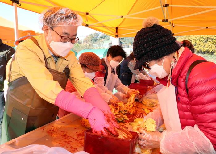 서울 금천구는 17일 ‘인삼 김치 담그기 체험 프로그램’을 진행했다. 사전 신청한 지역 홀몸노인 70여명을 대상으로 도시텃밭에서 재배된 배추와 무, 금천구 스마트 팜에서 재배한 인삼으로 직접 인삼김치를 담그고 품바 등 공연도 관람했다. 사진은 이날 유성훈 구청장(왼쪽)이 참가자들과 함께 인삼김치를 담그고 있는 모습. (사진제공=금천구청)