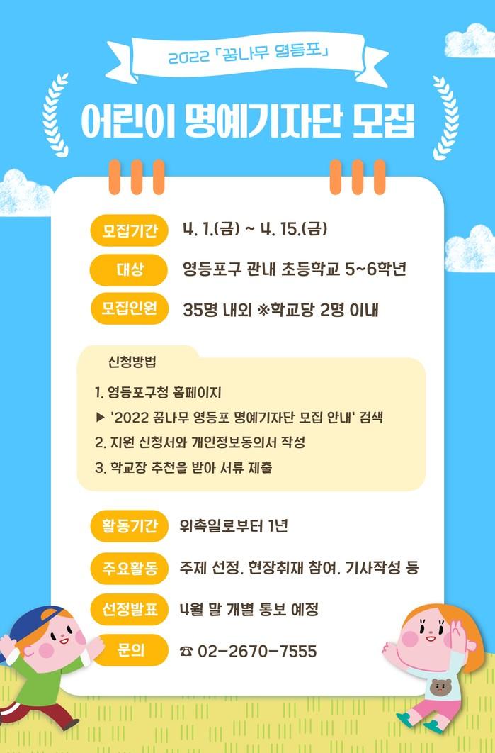 [시민일보 = 여영준 기자] 서울 영등포구(구청장 채현일)는 어린이의 시선과 생각으로 구정 소식을 전할 '꿈나무 소식지' 어린이 명예기자단을 오는 15일까지 모집한다고 밝혔다.