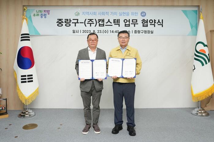| ▲ 23일 진행된 협약식에서 류경기 구청장(오른쪽)과 천세훈 (주)캡스텍 대표이사가 협약을 체결하고 기념촬영을 하고 있다. (사진=중랑구청 제공) |