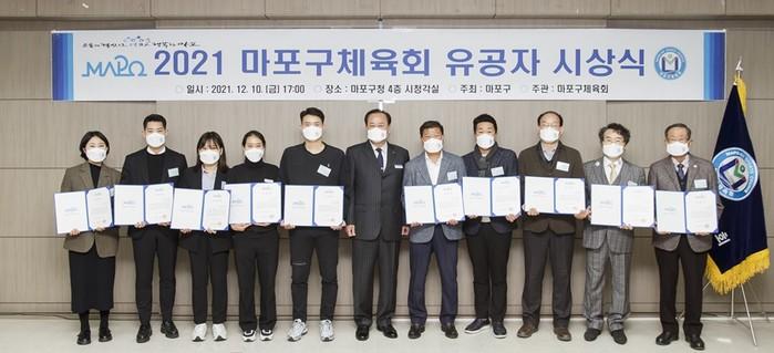 서울 마포구는 마포구체육회 주관으로 지난 10일 마포구체육회 유공자 표창 시상식을 열고 구 체육 발전에 공헌한 유공자 10명에게 표창을 수여했다. 사진은 시상식에서 유동균 구청장(가운데)이 수상자들과 기념촬영을 하고 있는 모습. (사진제공=마포구청)