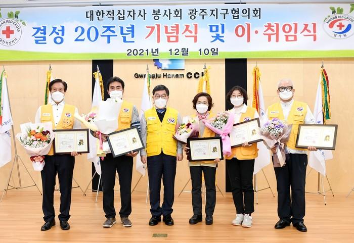 대한적십자사봉사회 경기광주시지구협의회는 최근 ‘봉사단 결성 20주년 기념 및 이·취임’ 행사를 개최해 제10대 채주병 회장에 이어 제11대 최문희 회장이 취임했다. 사진은 행사에서 신동헌 시장(왼쪽 세 번째)과 관계자들이 기념촬영을 하는 모습. (사진제공=광주시청)