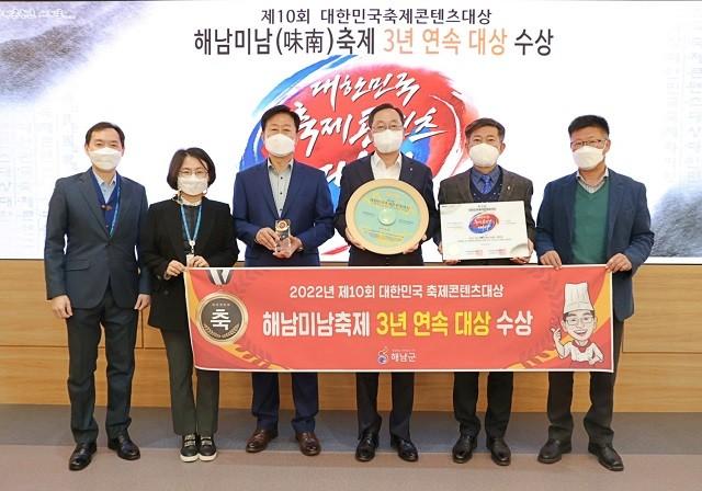 [해남=정찬남 기자] 전남 해남군의 대표 먹거리 축제인 해남미남축제가 2022년 제10회 대한민국축제콘텐츠대상을 수상했다. 해남미남축제는 2020년 축제프로그램 연출 우수부문 대상, 2021년 비대면축제 부문 대상에 이어 올해 축제콘텐츠 부문 대상을 수상하며, 3년 연속 대상 수상의 영예를 안았다.