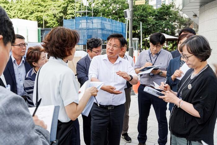 | ▲ 지난 5월 박강수 구청장(가운데)이 공덕동을 방문해 관계자와 주변 주민편익시설의 수요 등을 논의하고 있다. (사진=마포구청 제공) |