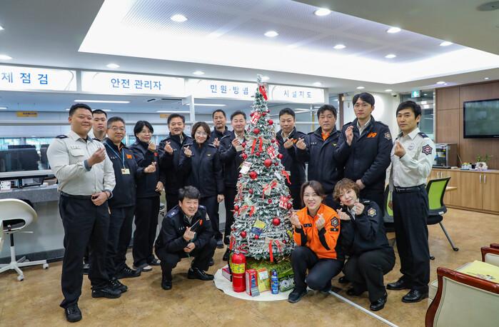 이번 홍보 트리는 3층 민원실에 설치된 크리스마스 트리를 활용해 꾸며졌으며, 트리 장식에는 ▲주택용 소방시설 설치·유지관리 안내 ▲리튬배터리 안전사용 수칙 ▲리튬배터리 분리배출 스티커 등이 부착됐다. 트리 하단에는 소화기와 단독경보형 감지기 등 실제 주택용 소방시설을 배치해 민원인이 직접 보고 확인할 수 있도록 했다.