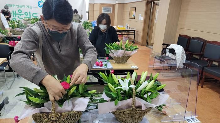 경기 포천시농업기술센터는 최근 2021년 생활원예 아카데미 수강생들의 꽃바구니 만들기 재능기부로 포천시치매안심센터에 등록된 치매 노인 가족 50명에게 마음 치유 꽃바구니를 전달했다. 사진은 이날 생활원예 수강생들이 마음 치유 꽃바구니를 만들고 있는 모습. (사진제공=포천시청)