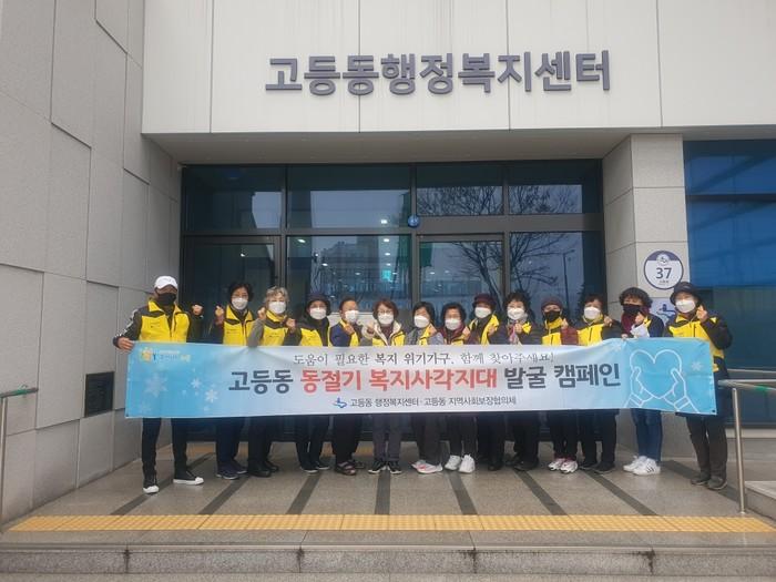 경기 수원시 팔달구 고등동은 최근 고등동사거리와 고등동오거리 및 화서사거리 SC제일은행 앞에서 어려운 이웃을 돕기 위한 동절기 복지사각지대 발굴 캠페인을 실시해 안내문과 손난로·손세정제 등 홍보용품을 주민들에게 전달했다. 사진은 이날 참여한 봉사자들이 기념촬영을 하는 모습. (사진제공=팔달구청)