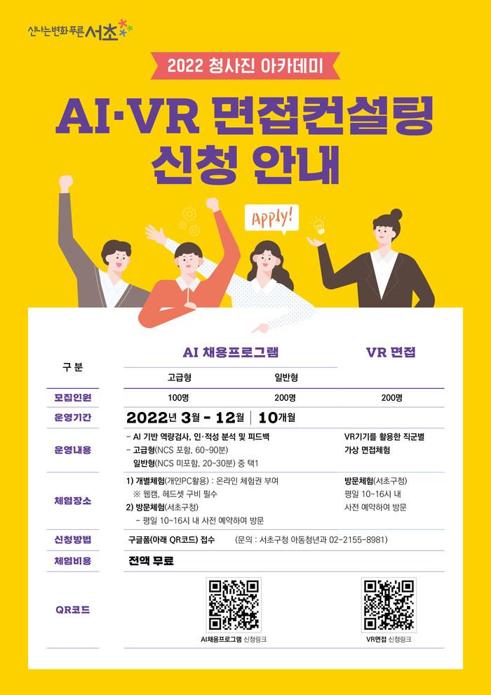 ‘AI·VR 면접컨설팅’은 사전예약제로 운영된다. 평일 오전 10시부터 오후 4시까지 희망하는 시간을 선택 후 서초구청 8층 교육실을 방문해 체험할 수 있다. 이 중 ‘AI 채용프로그램’의 경우 웹캠이 있는 개인PC와 헤드셋만 있다면 가정에서도 체험이 가능하다.