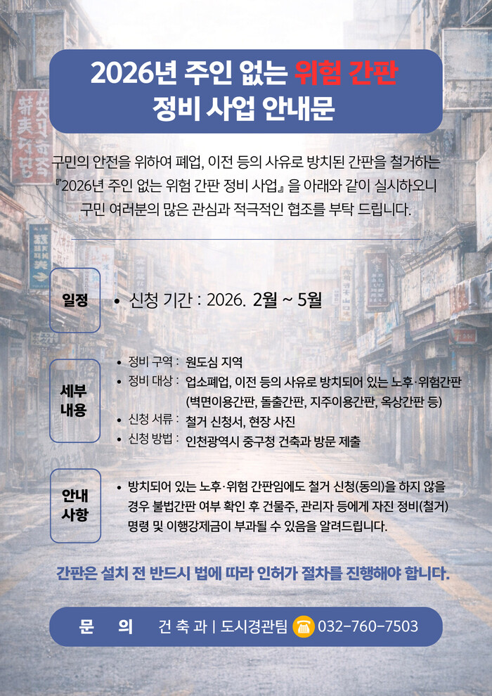[인천=문찬식 기자] 인천 중구(구청장 김정헌)는 도시 미관을 해치고 안전사고 우려가 있는 노후·방치 간판을 정비하기 위해 ‘2026년도 주인 없는 위험 간판 정비사업’을 본격 추진한다고 밝혔다.