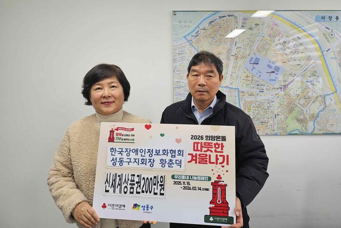 [시민일보 = 박소진 기자] 성동구(구청장 정원오) 마장동 소재 한국장애인정보화협회 성동구지회에서 지역내 장애아동 가정을 위한 신세계상품권 200만원을 기탁했다고 26일 밝혔다.