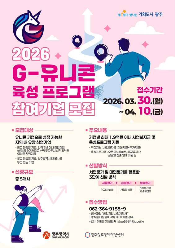 오영걸 경제창업국장은 “지(G)-유니콘 육성프로그램은 잠재력 있는 창업기업이 세계 시장에서 경쟁할 수 있도록 지원하는 사업”이라며 “광주를 대표할 기술력과 성장성을 갖춘 기업들의 많은 관심과 참여를 바란다”고 말했다.
